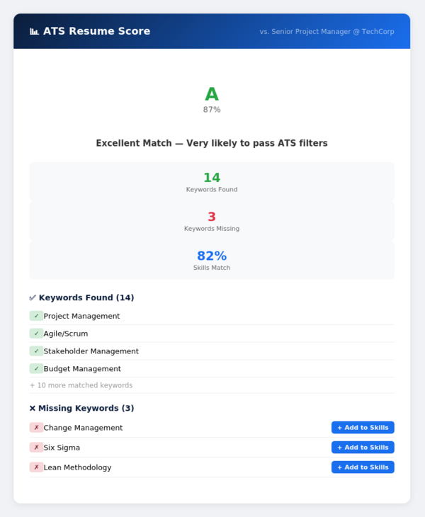 Paste any job posting and get an instant ATS compatibility score. See a letter grade (A+ through D), the exact keywords found and missing, your skills match percentage, and one-click buttons to add missing keywords directly to your resume.