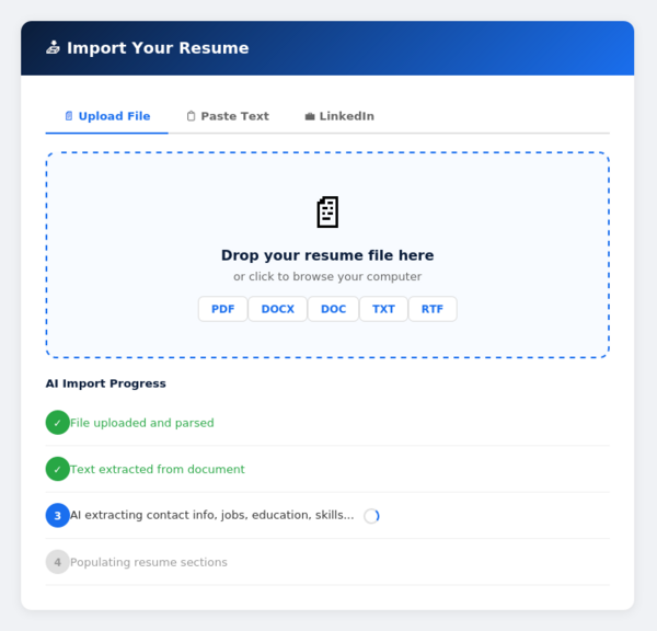 Don’t start from scratch. Upload your existing resume (PDF, Word, DOC, TXT, or RTF), paste text from your LinkedIn profile, or copy-paste from any document. Our AI extracts everything — contact info, jobs, education, skills — and fills in every section automatically.