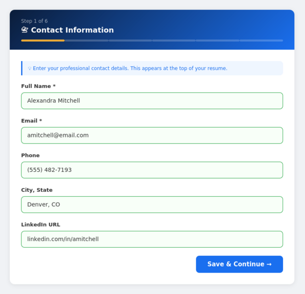 Our guided wizard walks you through each section one at a time. Start by entering your name, email, phone, and location. Fields auto-validate and your progress saves automatically every 30 seconds — so you never lose work.