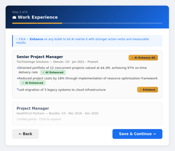 Enter your work experience and click the golden ✨ Enhance button on any bullet point. Our AI instantly rewrites it with stronger action verbs, quantified achievements, and the professional language that recruiters look for.